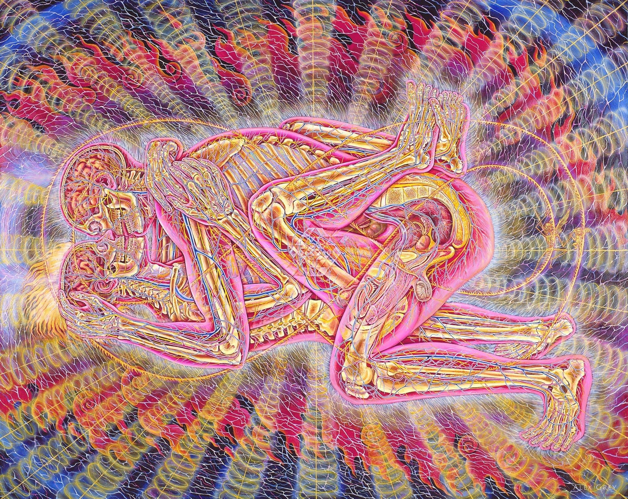 Where does Alex Grey fall? Well, as a basic fact he is an outsider. He was represented by Stux Gallery in the 80s, who also represented Andres Serrano, Doug and Mike Starn, Inka Essenhigh, Dennis Oppenheim, Paul Laffoley and others. And he was in a show at MoMA PS1 around that time. But his career in the gallery circuit didn’t last long. In practical terms he doesn't really operate in the kitsch industry or the kitsch institution. But I thought it especially useful to discuss him in the context of these ideas because he doesn't totally fit aesthetically either. On the one hand he's kitsch in the extreme, he's so genuine about what he paints it's a bit embarrassing and hard to take seriously at times. But on the other he is producing works that check most of my boxes. They seek to move the viewer aesthetically, thereby to provoke the viewer into a new experience of what beauty can be. They strive to sustain and intensify the fleeting moments of aesthetic beauty in life, whether those moments are an LSD peak or an orgasm. They possess modernism's classic "mania for totality" as Arnold Hauser put it. Each work is an image of the macrocosm, they are specific images which tend to explode outwards into a weltanshauungg. They are consistently loud, but at their best they are still nuanced.