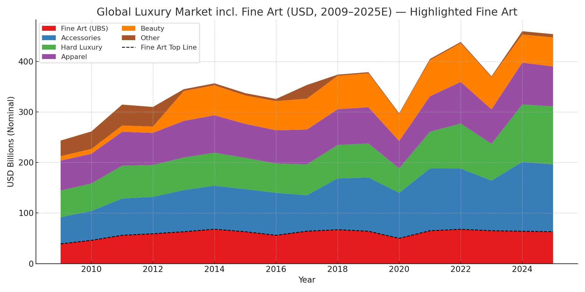 Here’s a layer chart showing the total personal luxury sales volume between 2009 and 2025. (I would’ve loved to have kept our 2005 starting date but luxury goods data from pre-2009 was not easy to scrape. If I find a way around this I’ll republish later.) For our purposes this is good enough. Note that because the total volume of luxury sales is much higher, the appearance of the art market data is somewhat squished, even though the data is consistent. Further, this shows the significant stability of the art market in sales terms when compared to the volatility of personal luxury sectors. Given more time it would be essential to compare also against an expanded luxury category that included markets like wine and spirits, luxury and collectible cars, yachts, private jets, luxury hospitality and so on.