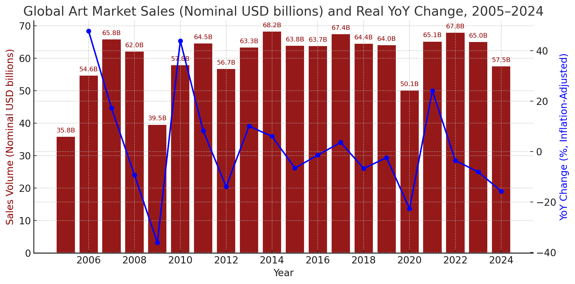 The after declining ~20% (all YoY changes measured in inflation-adjusted terms) to $50.1 billion in sales volume in 2020, the market recovered a similar ~20% to $67.8 billion in 2022. For context, the art market crashed 35% to ~$39.5B in 2009, but rebounded roughly 56% over two years to ~$64.6B in 2011. In both cases I’m measuring from the pre-crisis year to the low of each crisis (2009 and 2020 respectively) to the subsequent high before a pullback (2011 and 2022 respectively). When adjusted for inflation, the post-2008 rebound was more than twice as strong as the post-pandemic one.