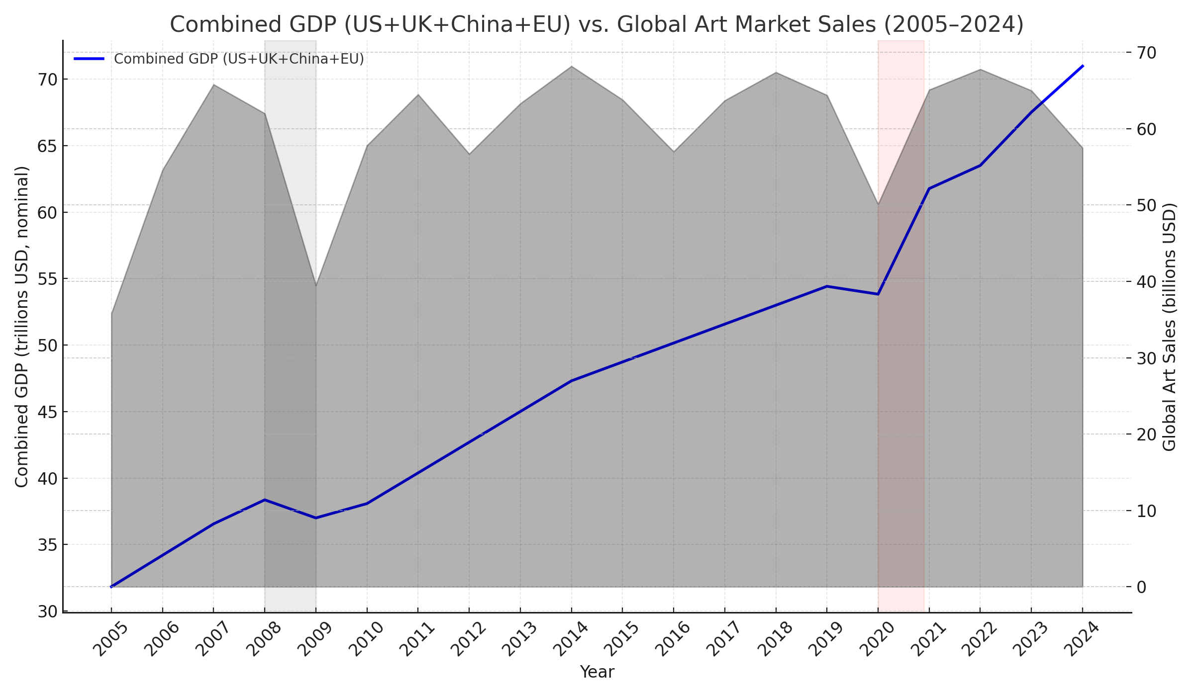 This kind of technical analysis is helpful, but only in a limited way. It is not enough data to say with certainty that there is a lagging correlation between global stock markets and art sales or that it has definitively been broken as of 2024/5. This chart seems to suggest that 2025 should see a strong recovery in the art market, but that does not line up very well with our previous observations and general hunch — but it could be the case. If we go back to the chart comparing combined GDPs with art sales, we see the apparent correlation breakdown at the same place. There could be another factor to explain this.