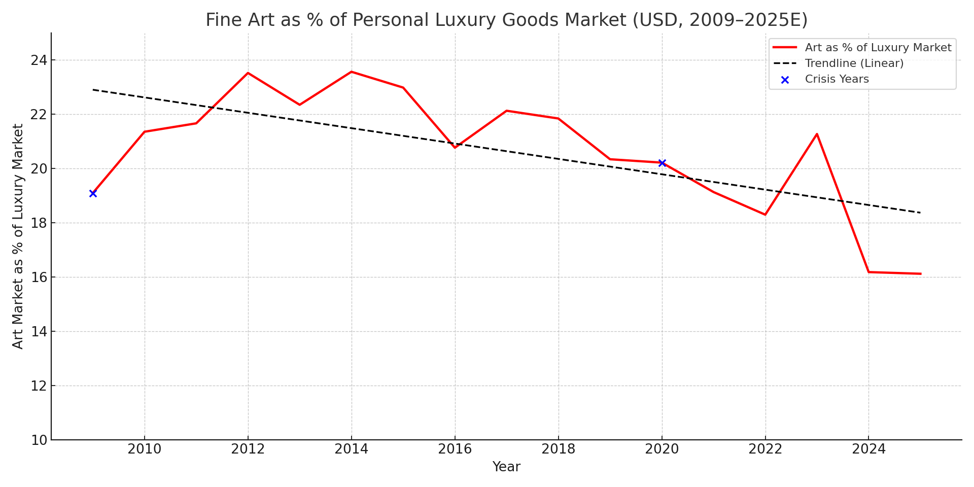 This chart takes that same data but hones in on art sales as a percentage of the global personal luxury goods market. I’ve added an averaged trendline to underscore the point. The spikes such as in 2014 and 2023 don’t necessarily represent growth in the art market, but the volatile declines in spending in other luxury sectors.