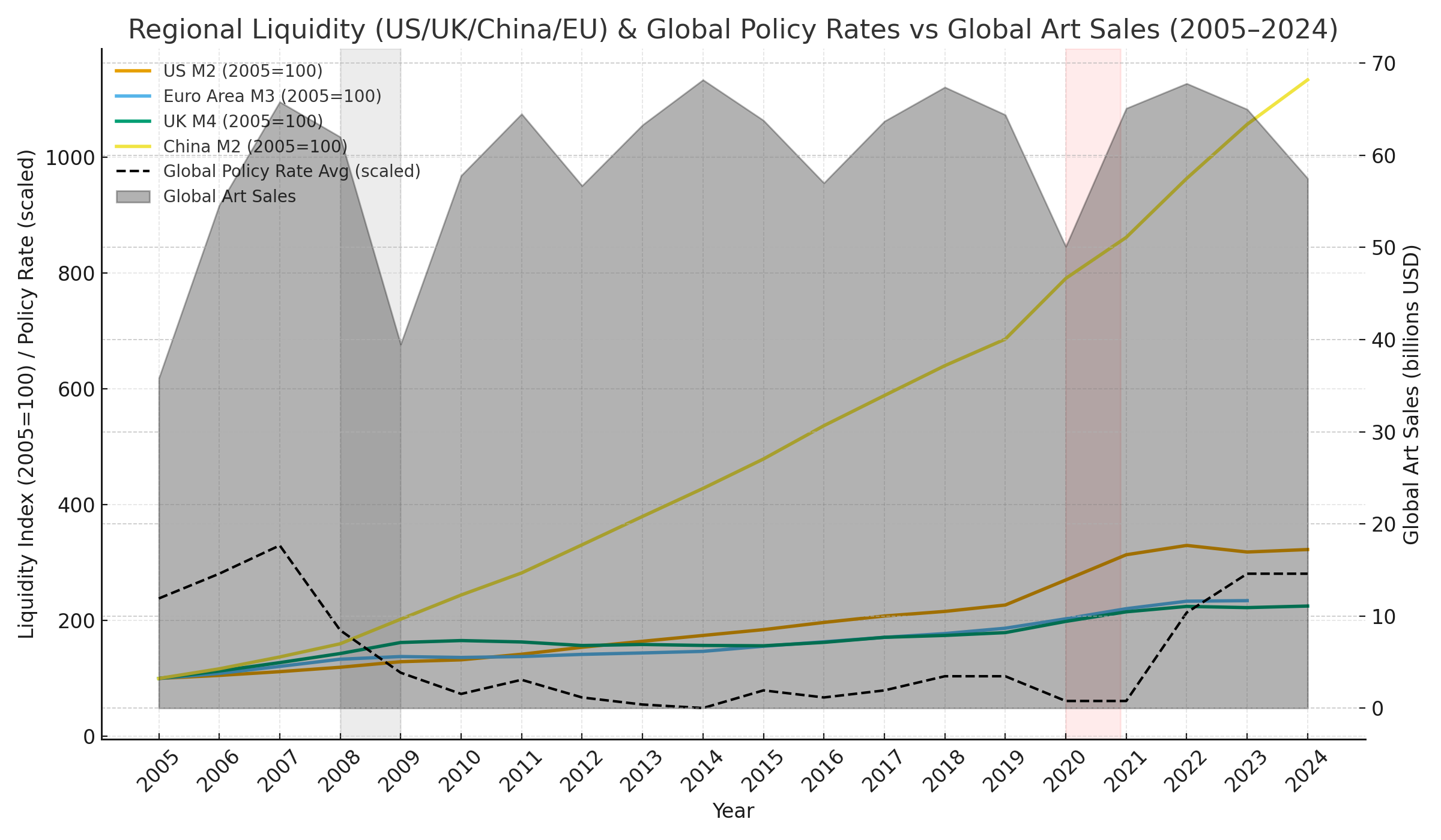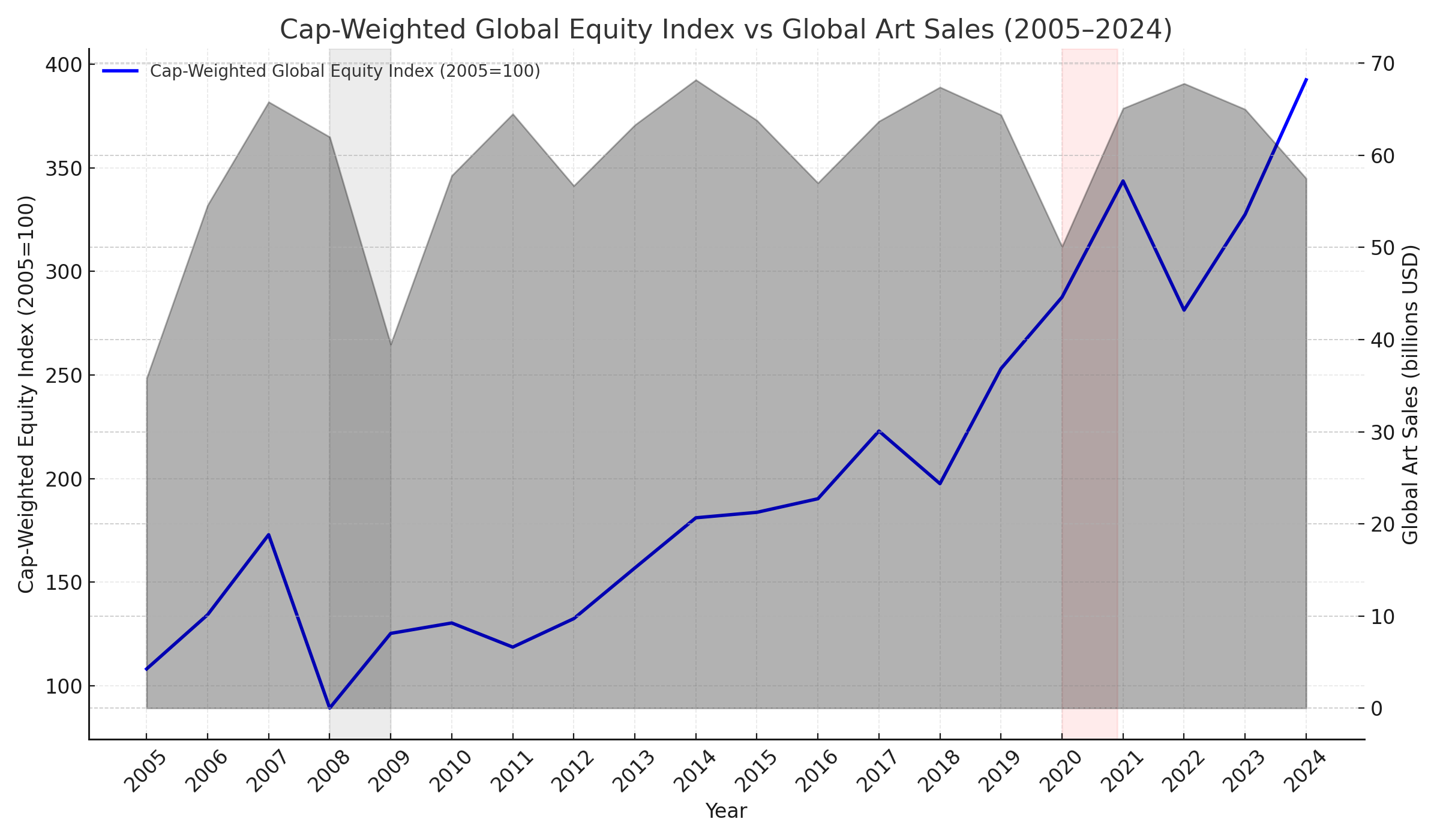 Looking now at combined weighted equity indices for these same regions against global art sales volume, there is a clue to what we saw above — the art market tends to track equities with a lag of roughly a year, and this offset correlation holds during the inter-crisis period. The combined indices plunge in 2008, with the corresponding decline in art sales appearing in 2009, and the recovery plays out in the same staggered way through 2010–2011. A similar pattern shows up around 2018/2019. Still, it’s worth noting that this may not be a strict causal link — major estate sales, taste cycles, and geographic demand shifts can create large swings in turnover that have little to do with stock performance. But the most recent divergence is striking: equities recovered in 2023 and even harder in 2024, yet art sales continued to fall in 2024, which could signal more than just a delayed reaction.