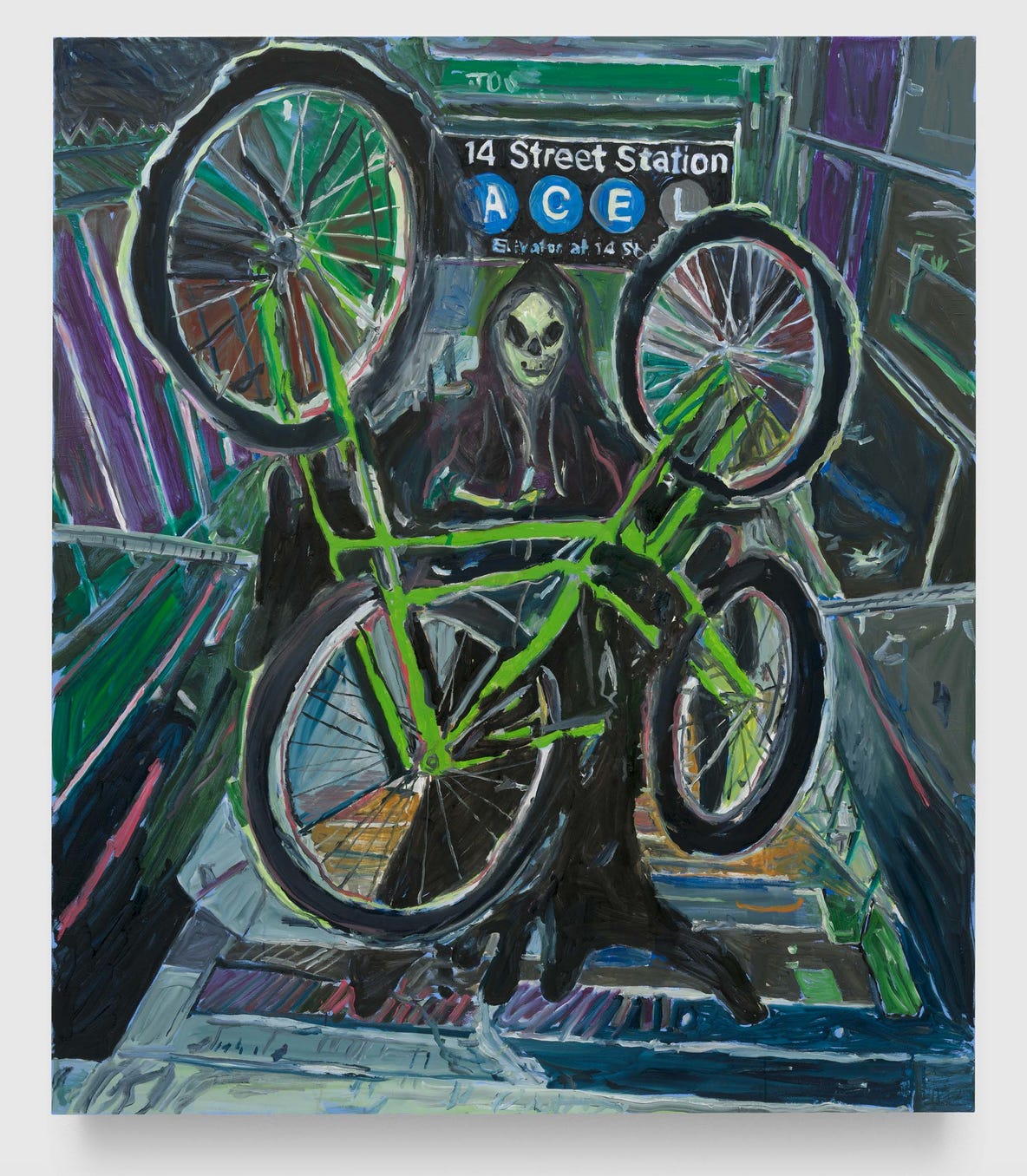 Zwirner opens the season in LA with a modest show of new works by prototypical Gen X slacker Josh Smith. 19 paintings and one sculpture make up Smith’s first LA solo show. All of the works take the grim reaper as the subject, and all of the paintings involve the grim reaper riding, holding, or crashing a bicycle. They are crudely painted, characteristic of Smith’s practice. They are easy for me to enjoy but hard for me to take seriously as great art. But to be generous, I don’t think that’s really Smith’s goal. As I said, I think Smith represents the slacker image of his generation, like the band Pavement or Linklater’s film. It’s this broad cultural stereotype resulting from that generation’s apathy contrasted against the idealism and ambitions of the boomers that Smith embodies. And I can’t help but find it comfortable and relatable. As is evident from this issue of Camel as well as my previous issues, I have a bit of a bone to pick with Contemporary Art, which I see as a definite epoch of artistic production with definable ideological dogmas that result from boomer ambition in the fine art. So I must admit to being charmed by an artist who has become quite successful all the while belying a shrugging “whatever” towards the institutions and ideals of Contemporary Art.