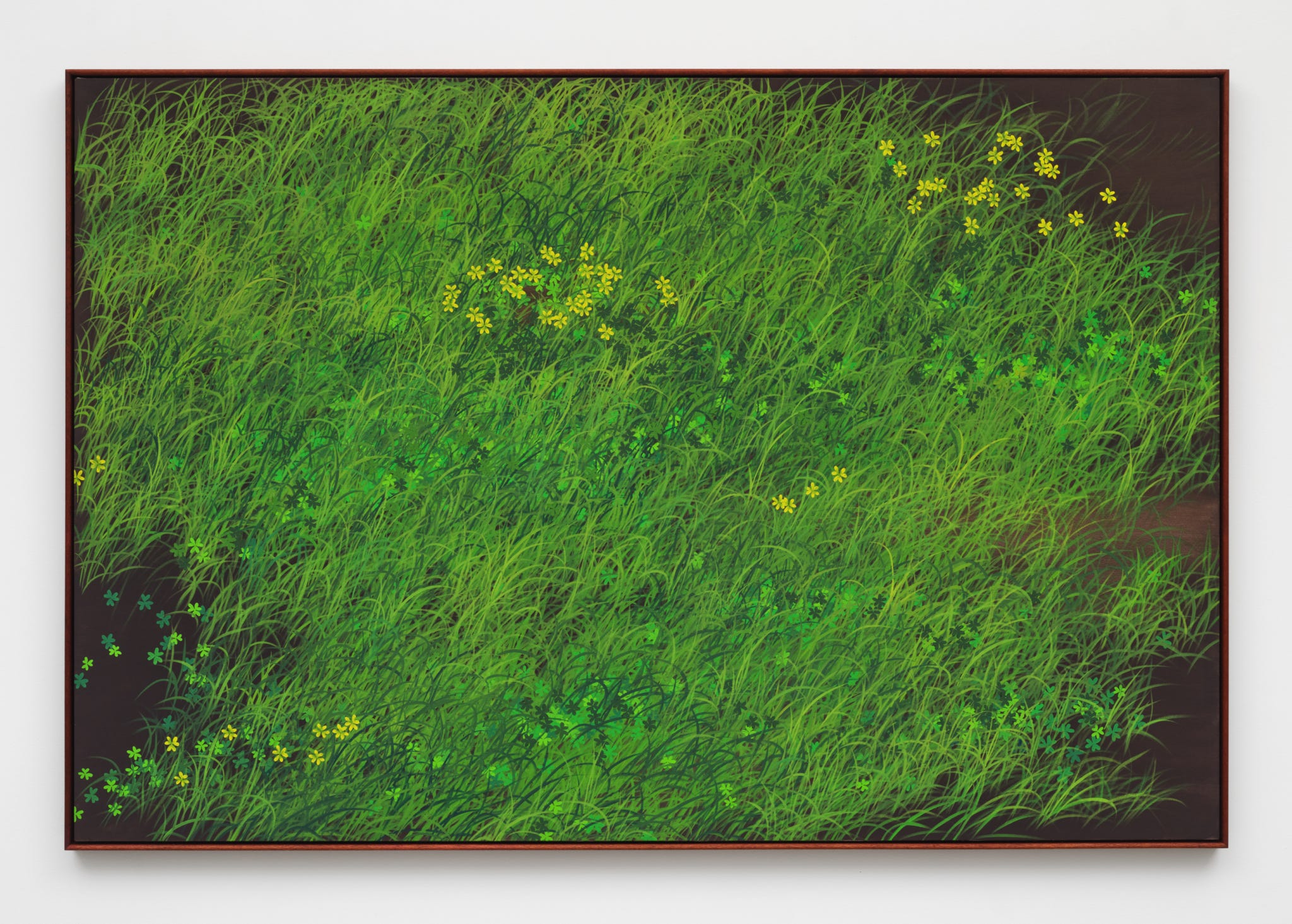 It is time to touch grass. I was shot by the Karma security guard for petting these paintings with my crumby greasy hands. I thought these were lukewarm paintings. Its a group of seven paintings of layers of green grass on dirt backgrounds. They seem to be built up layer by layer, some with undulating dirt beneath, others with clovers, some clovers obscured by blades of grass, others poking through surface in moments of gratifying change amidst the rather monotonous green strokes. Not particularly moving. They are underwhelming, if I’m being totally honest. I wanted to like them more that I actually did. They are pretty.