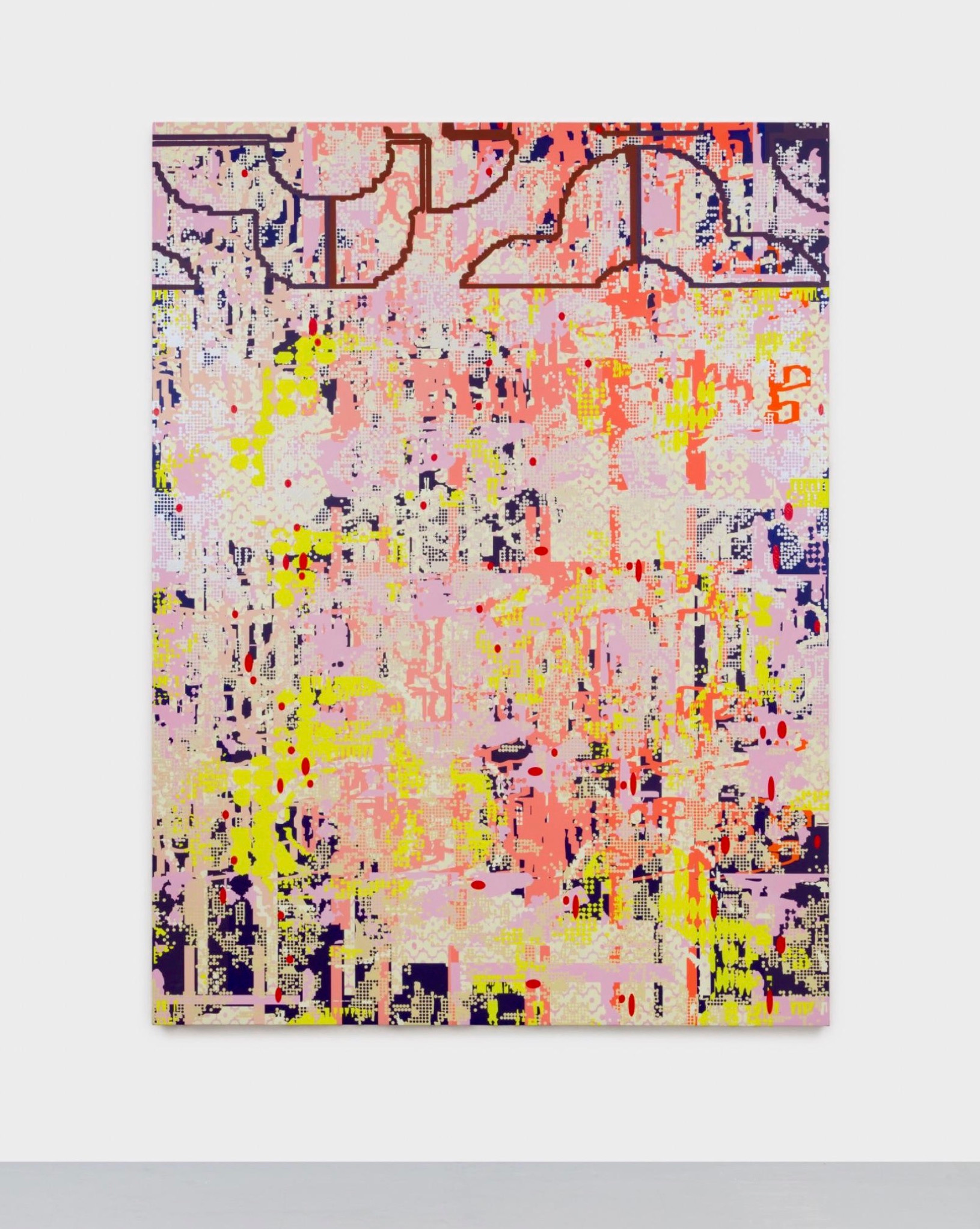 Heilbron is an LA based painter working with patterns and stencils to produce richly dynamic abstract canvases. The process involves the appropriation and digital remixing of design patterns, specifically from 20th century Austria, and employing them as screens that layer color onto the canvases’ surfaces. In previous works these layered abstractions also included some more tangible elements such as figures and text, but in All Systems Fail, those are removed to focus on the rhythms of the abstracted patterns.
